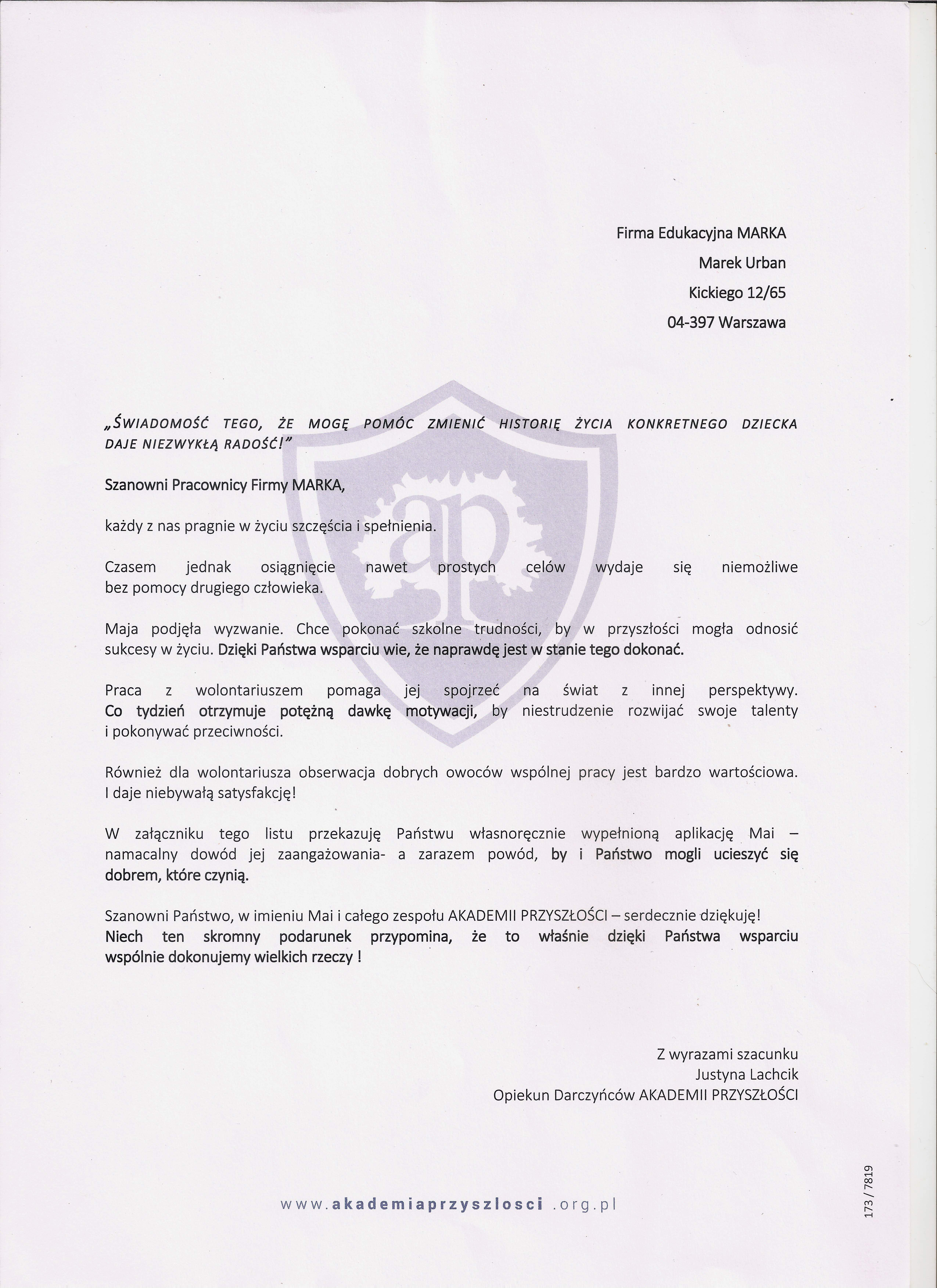 Od 2014 roku współpracujemy z fundacją Akademią Przyszłości, która wspiera dzieciaki ze szkół podstawowych w przezwyciężeniu różnych problemów w nauce i rozwoju talentów.